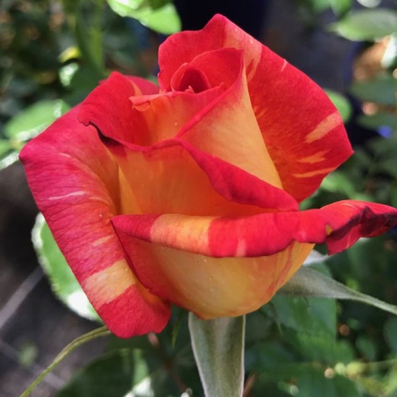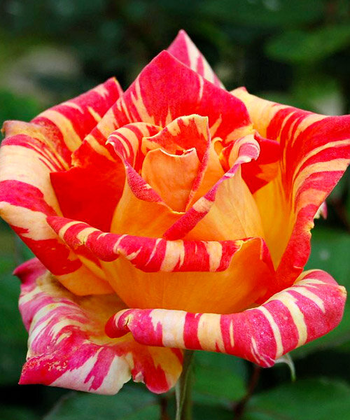 | Характерна с цъфтеж в меко червено, набразден с ярко жълти ивици. Ароматът е мек и сладникав.Цветовете са с 20-30 венчелистчета и среден диаметър 9см, предимно единични, разтворени, със средна плътност, често единични или събрани в малки клъстери.Цъфти на периоди през целия сезон. |