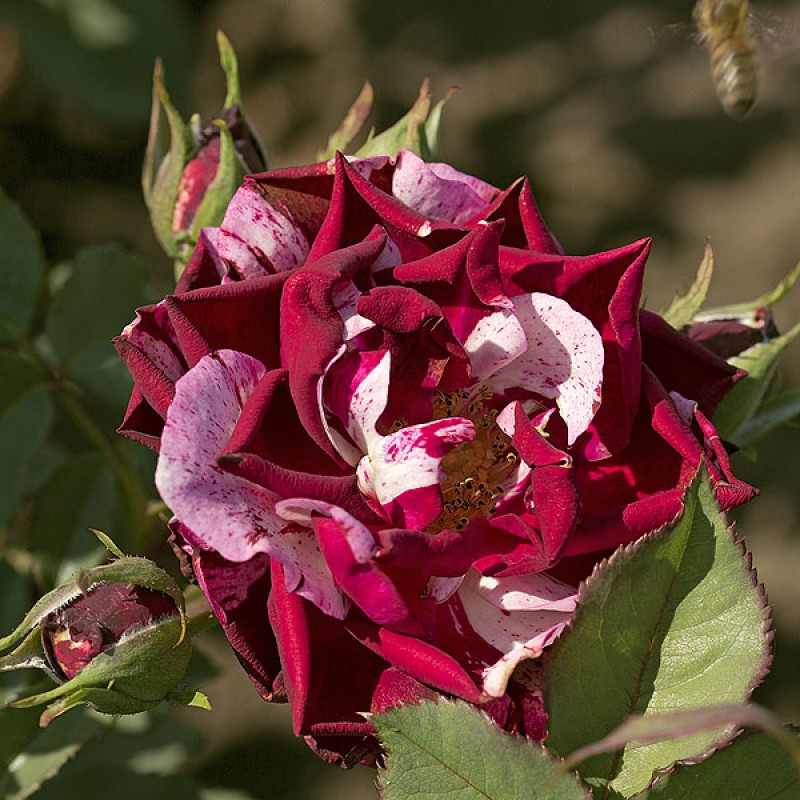 | Много ароматна роза с кичест цвят.Интересен ивичест цвят в червено-лилавата гама ( на бургундско вино) и светли кремави ивици.Цветът е кичест , цъфти на малки съцветия през целия сезон.Листата са лъскави и тъмно зелени.Достига височина от 70 до 90 см.Силно устойчива на заболявания. |