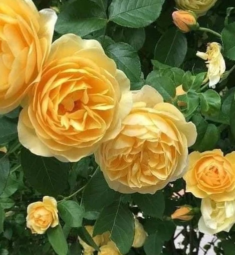 | Цветовете в началото са много пълни и заоблени, по-късно се отварят до плитки чашки.Цветът е жълт, към горчица. Силен аромат.Розата прави здрав храст с широк, разпръснат растеж. |